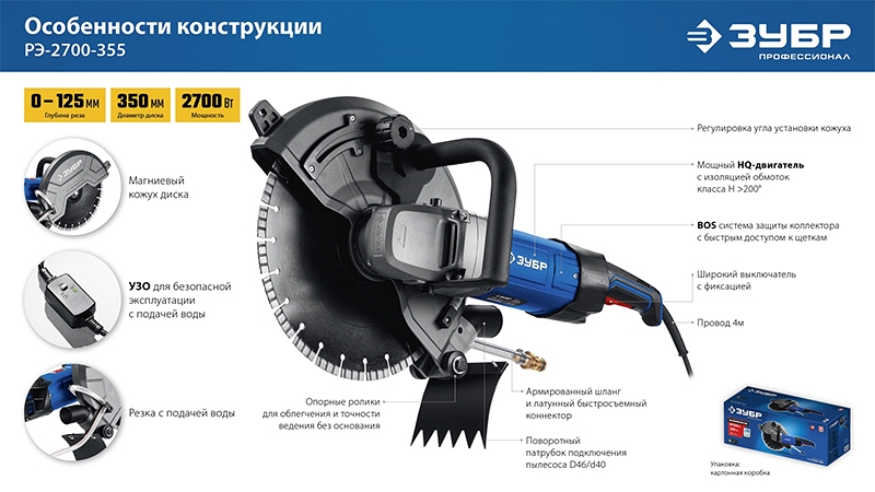 Преимущества электрического резчика по бетону Зубр Профессионал РЭ-2700-355: